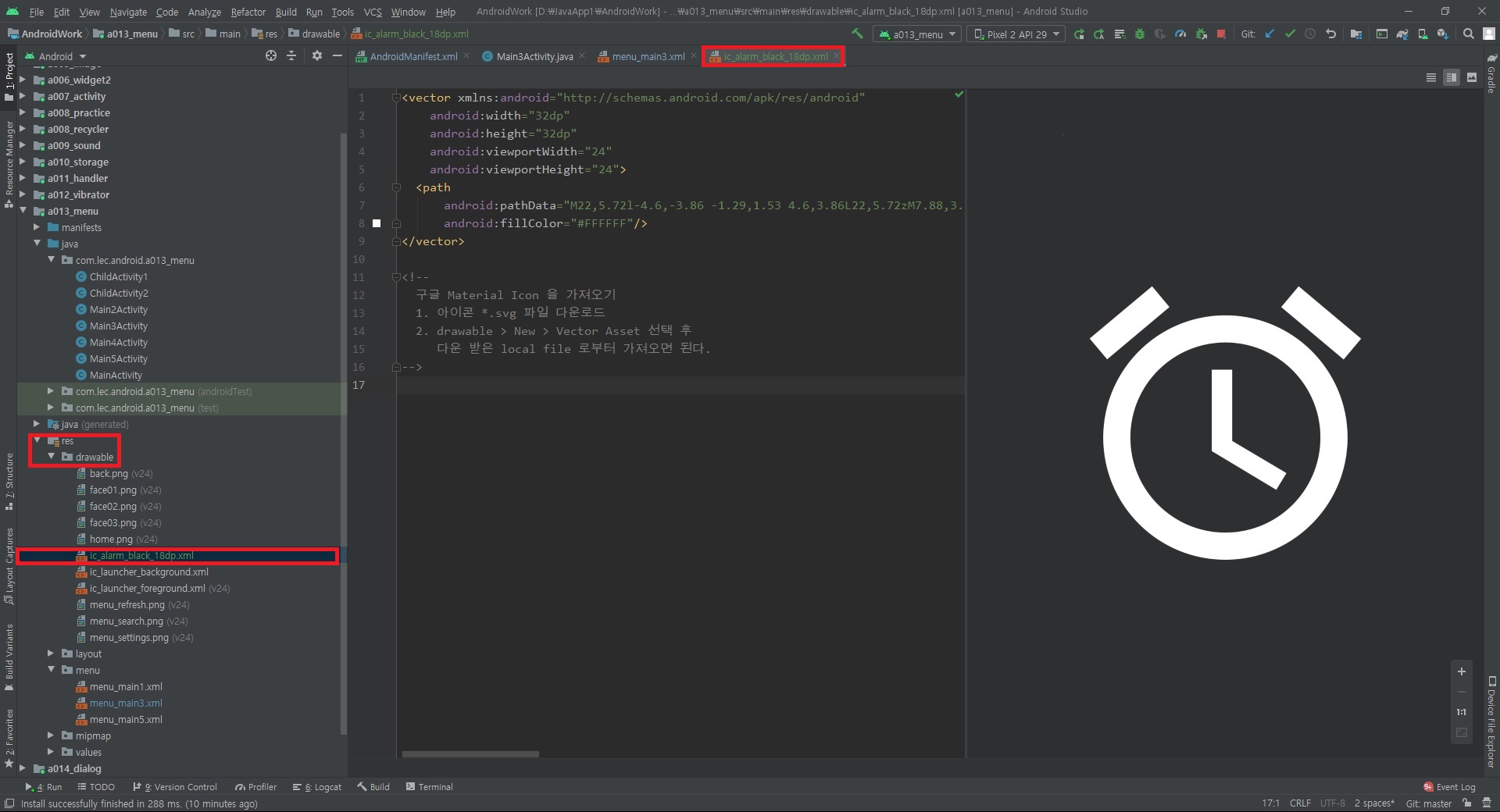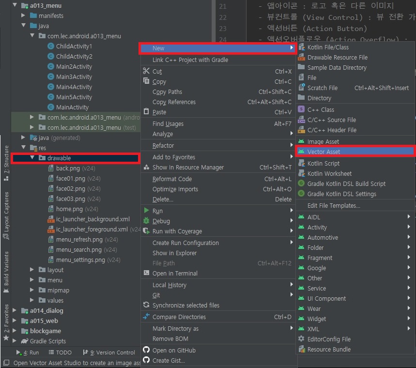 : 원하는 그림 SVG로 다운 > res > drawable > New > Vector Asset 클릭