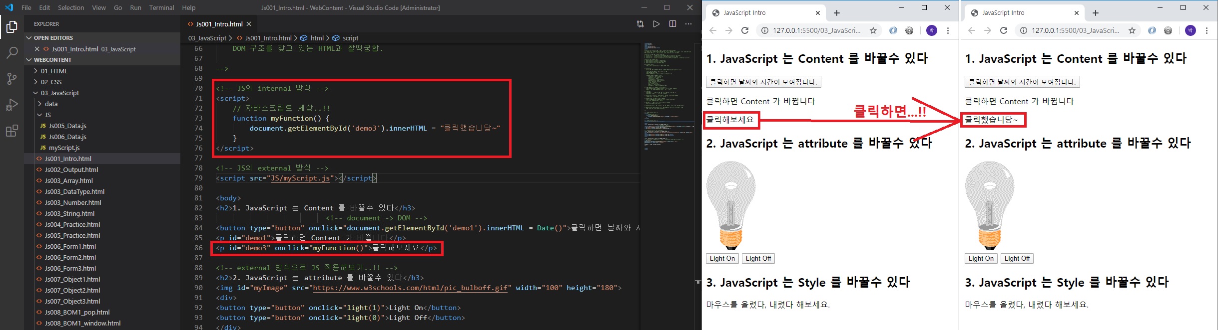 2. internal 방식 : <script></script> 태그 안에 JavaScript 코드 기입