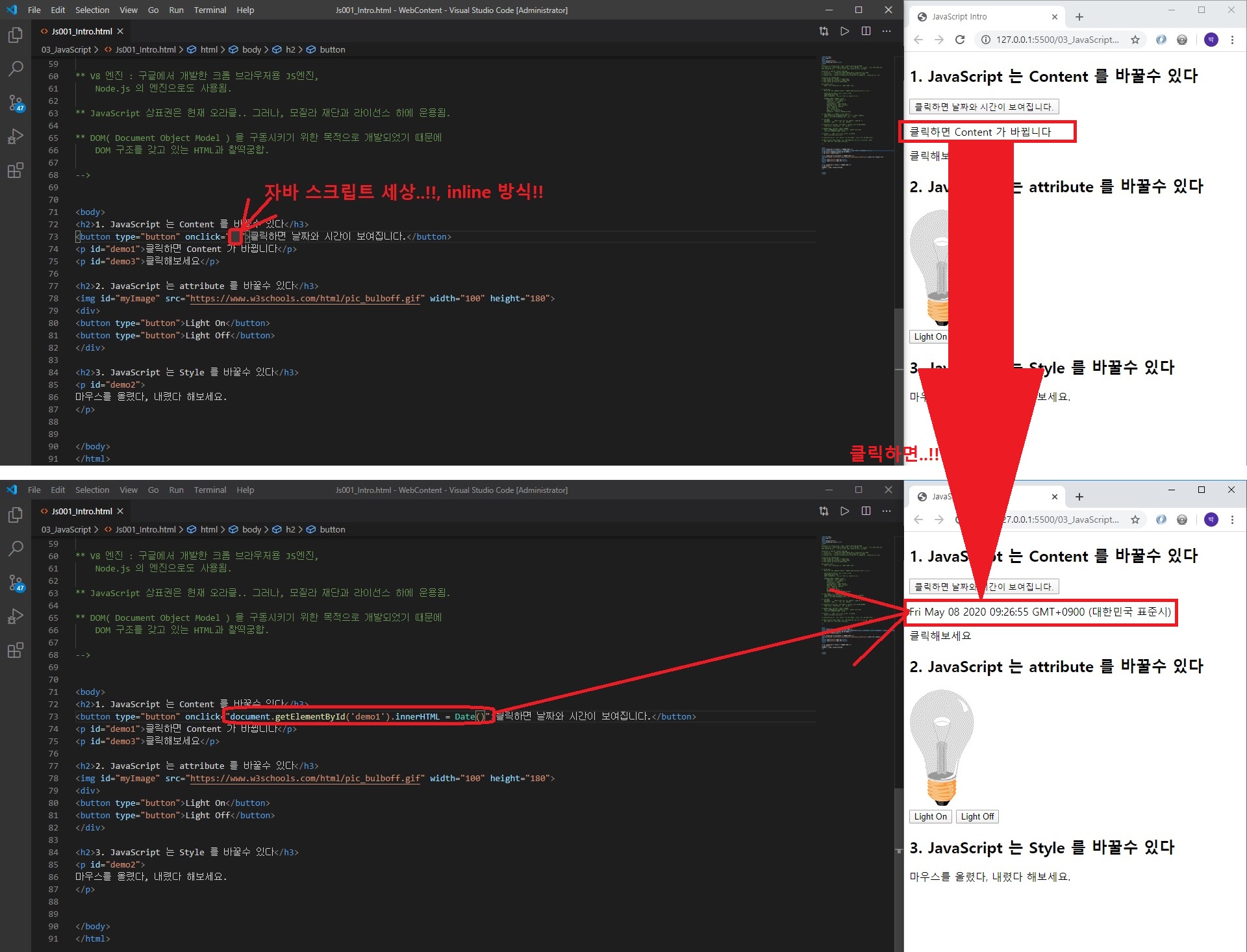 1. inline 방식 : 태그의 onxxx 속성(이벤트) 값으로 JavaScript 코드 동작.