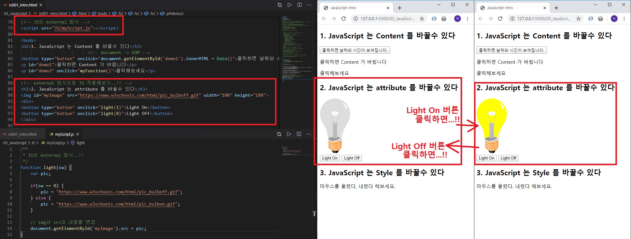 3. external 방식 : <script src="myScript.js"> 와 같이 src 속성에 외부 JavaScript 파일 명시