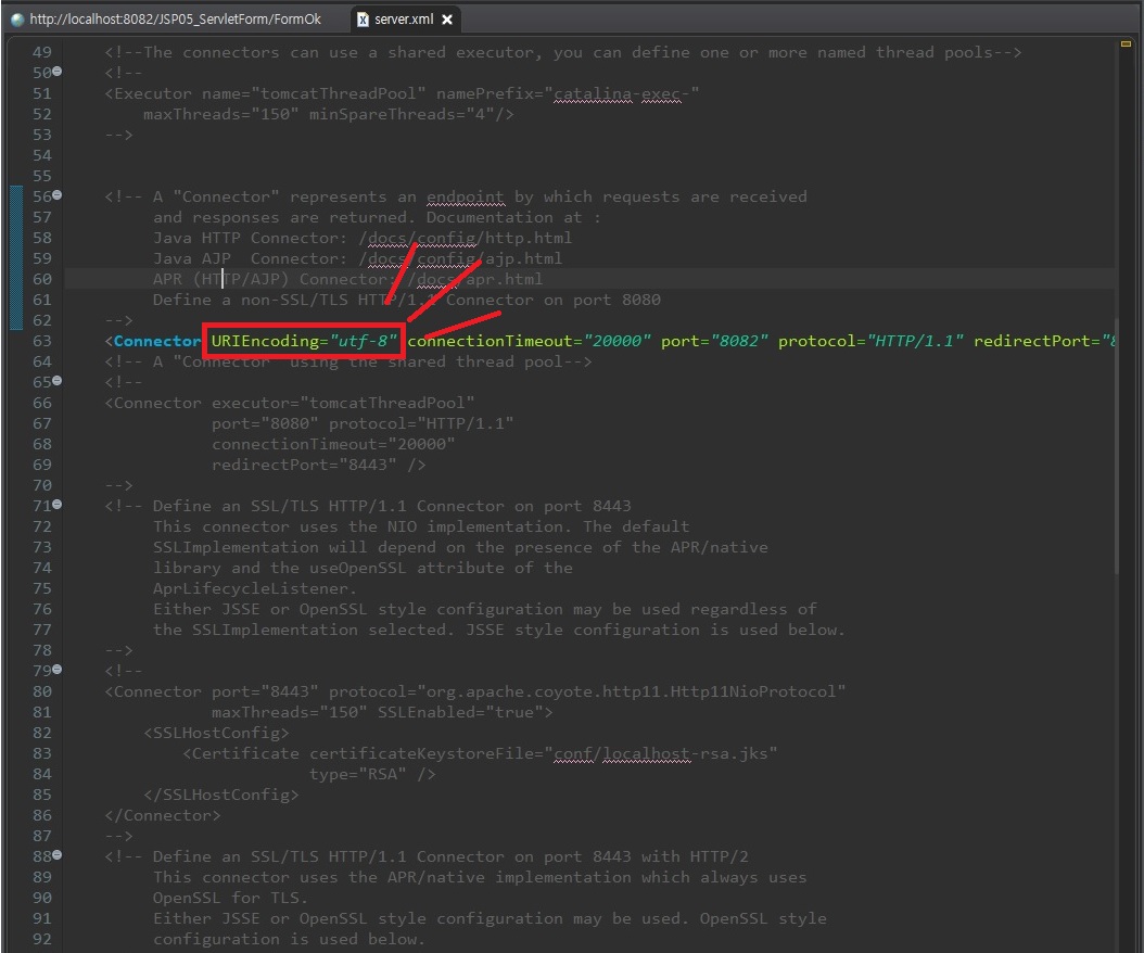 > server.xml에서 <Connector>에 URIEncoding="utf-8" 추가하기(추가 이후 서버 재시작)