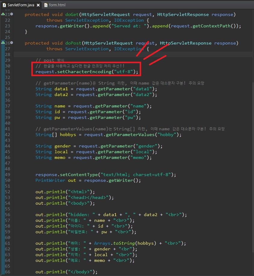: doPost메소드 내에서 설정, request.setCharacterEncoding("utf-8"); 추가하기