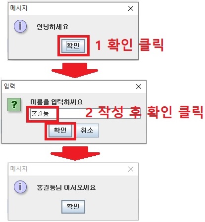 JOptionPane.showMessageDialog(null, name + "님 어서오세요.");