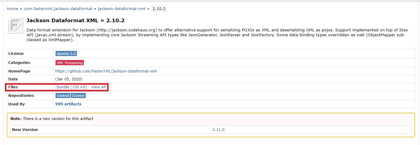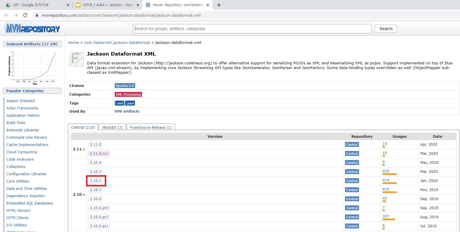 : mvnrepository.com/artifact/com.fasterxml.jackson.dataformat/jackson-dataformat-xml > 2.10.2 버전 선택