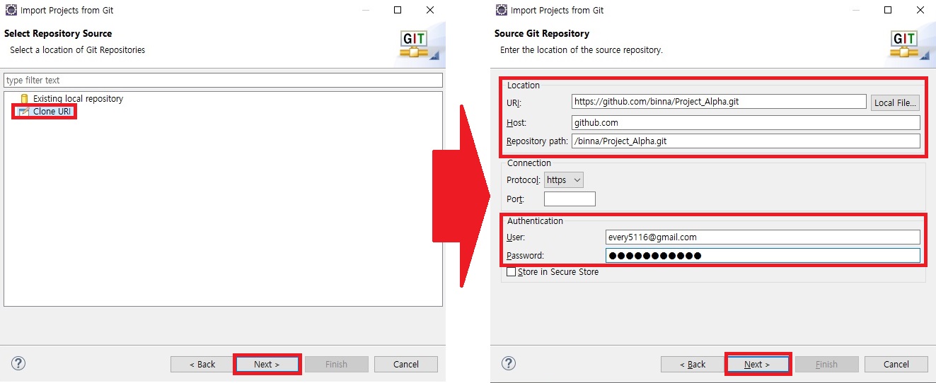 > Clone URI 선택 후 Next 선택 > 빨간 표시한 항목 채운 뒤 Next 클릭