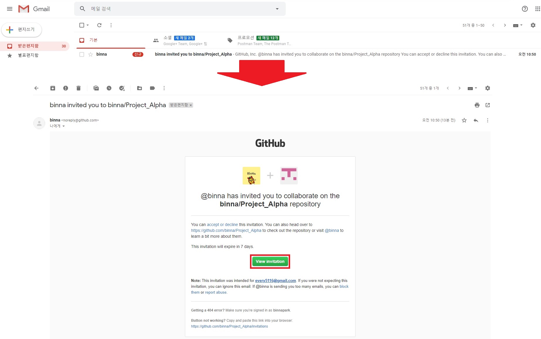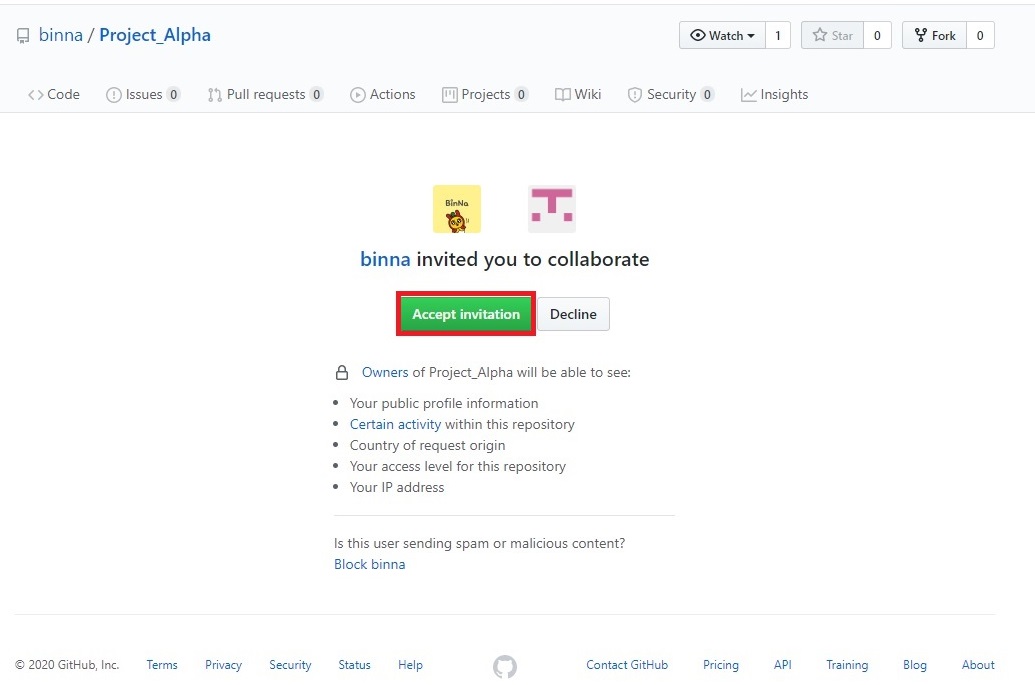> GitHub 로그인 된 상태에서 초대장을 타고 들어가면 초대 동의하는지 물어보는 창이 뜸 > Accept invitation 클릭