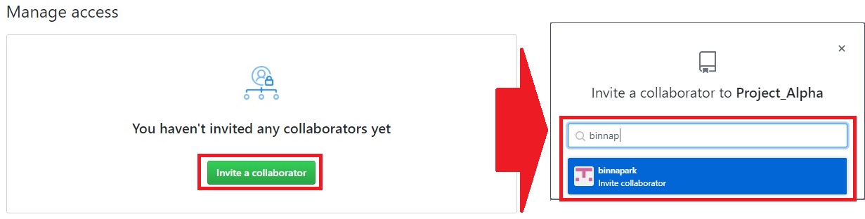 > Invite a collaborator 클릭 > 원하는 협업자 검색(GitHub 회원일 경우 바로 검색 뜸)