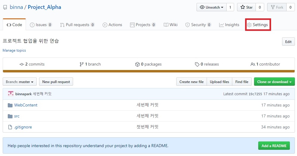 : 협업자 등록할 해당 Repositories 클릭 > Settings 클릭