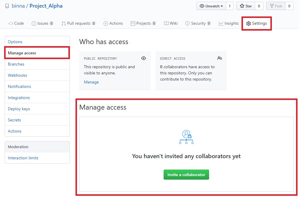 > Manage access 클릭 > 협업자 등록 페이지로 이동