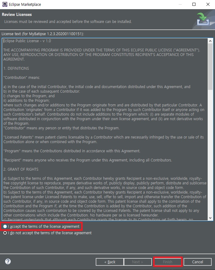> I accept the terms of the license agreement 선택 후 Finish 클릭 > MyBatis 플러그인 다운로드가 진행됨...!!