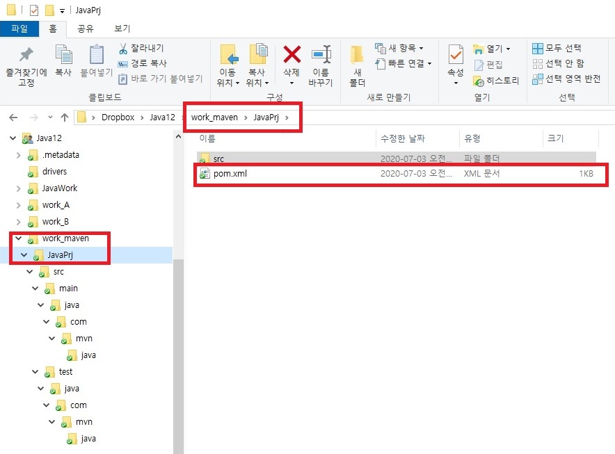 ** 패키지가 정상적으로 만들어지면 work_maven > javaPrj > target에 jar 파일을 확인 할 수 있다.