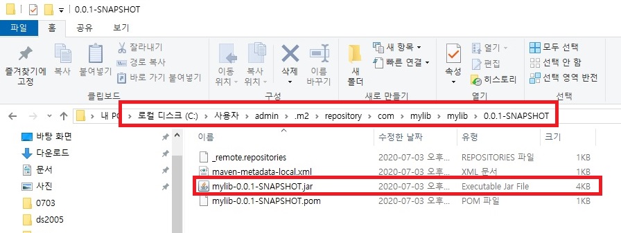 > 성공했다면 콘솔창에 확인된 경로에 아래와 같이 jar 파일이 확인됨