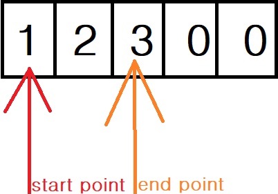 예) 1 2 3 0 0 -> start 1, end 4 -> 총 3개의 데이터(4 - 1)