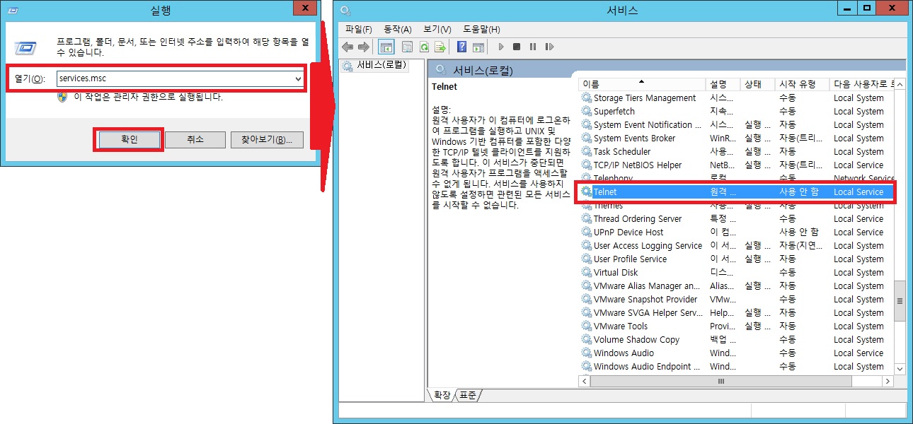 > 서비스로 이동, telnet을 찾기(현재는 해당 서비스 사용 안함 상태)