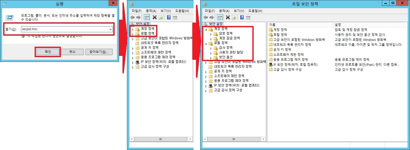 : 윈도우 로고 + R, 실행 열기 > secpol.msc 입력 후 확인 클릭