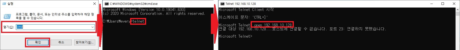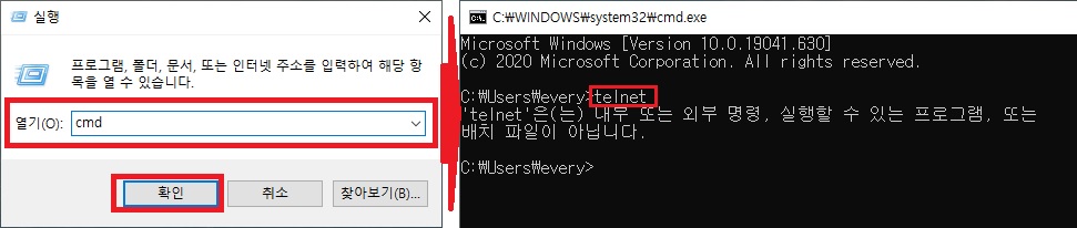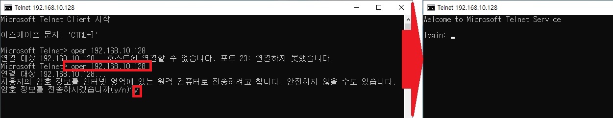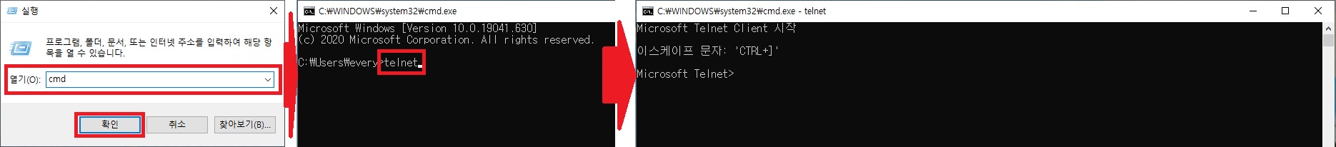 > 명령 프롬프트로 이동, telnet 명령어 입력
