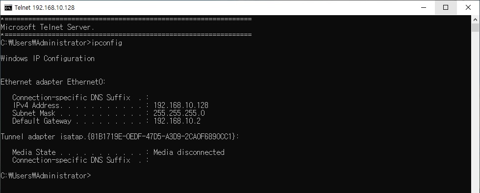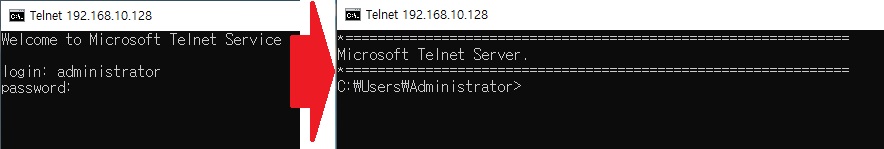 > 다시 명령 프롬프트로 이동, telnet 명령어를 이용하여 원격 접속 시도하면 정상적으로 잘 동작함...!