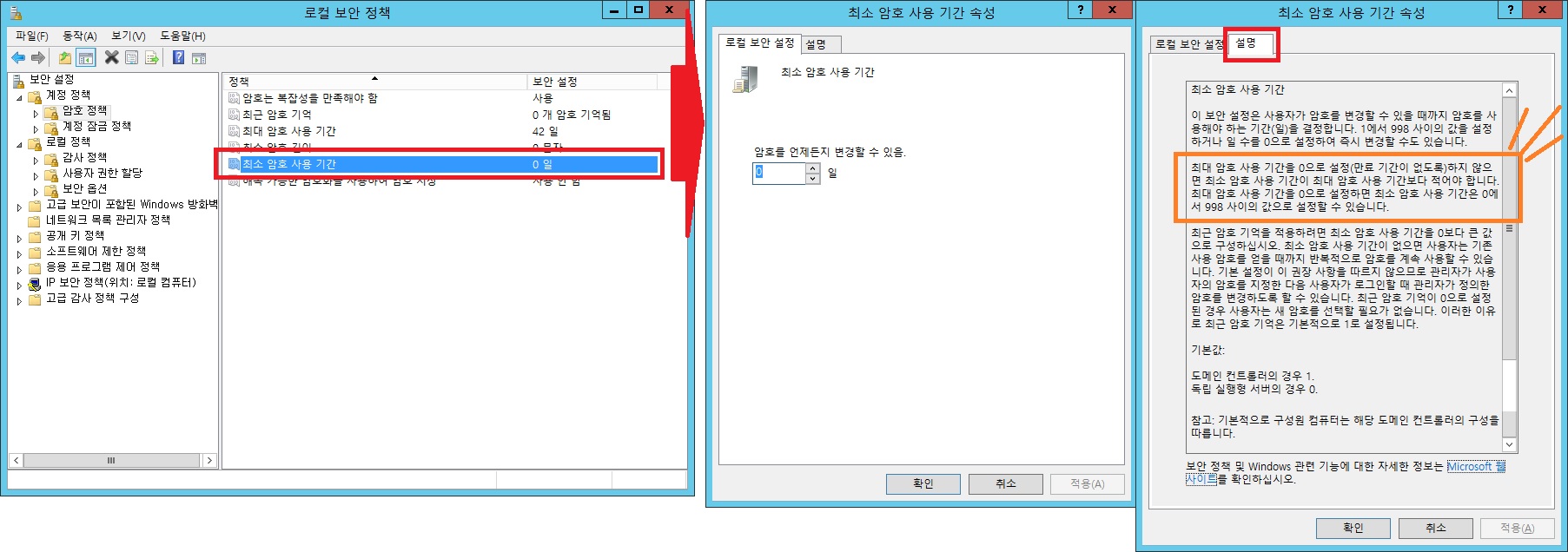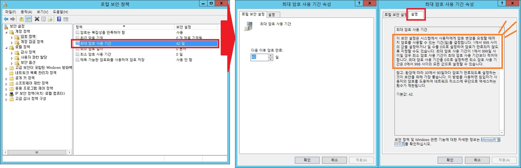 3. 로컬 보안 정책에서 암호정책 > 최대 암호 사용 기간, 계정 잠금 정책 > 계정 잠금 임계값이