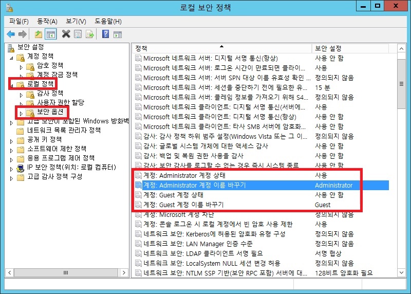 ① 보안옵션 : Administrator 계정 상태, 이름 바꾸기, Guest 계정 상태, 이름 바꾸기