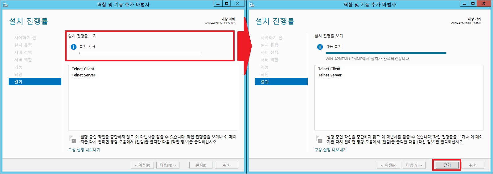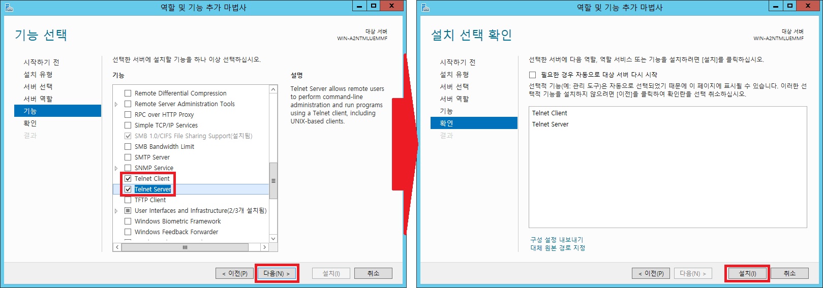 > 기능에서 텔넷 클라이언트(Telnet Client), 텔넷 서버(Telnet Server) 체크(총 2개의 항목)