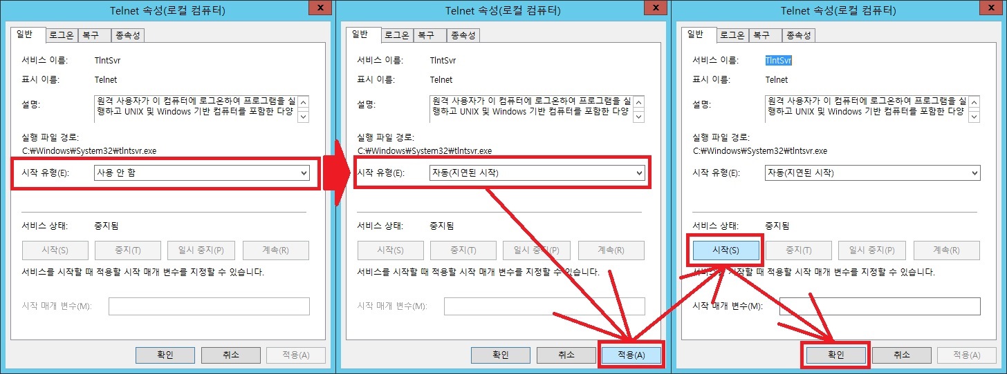 > telnet 서비스 더블 클릭, 속성으로 이동