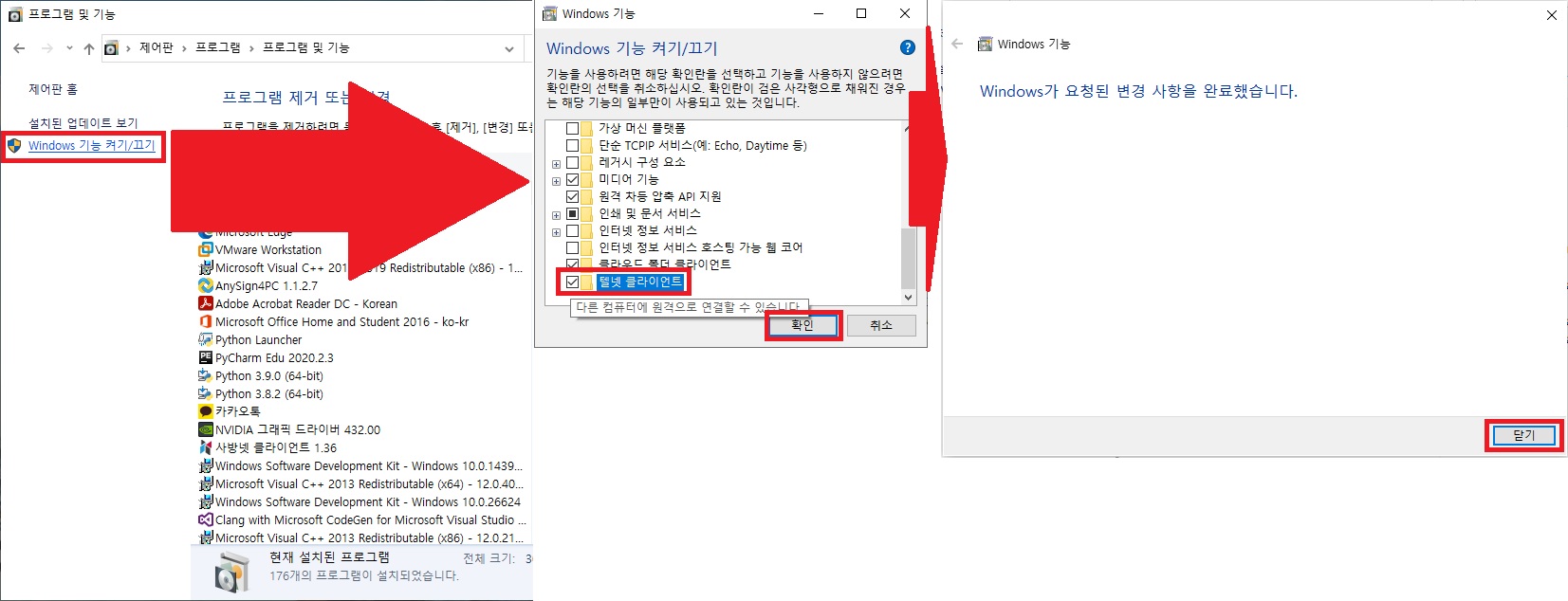 > 텔넷 클라이언트 체크하고 확인 클릭