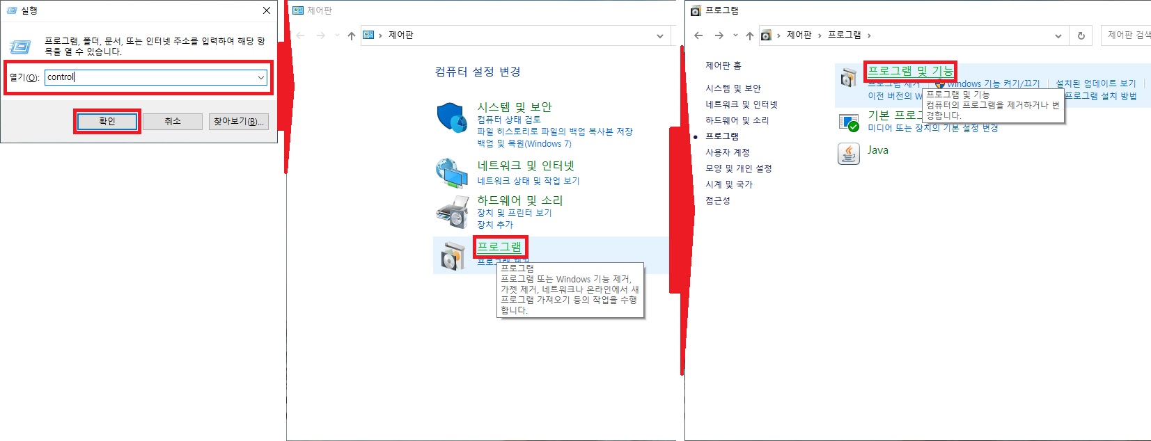 > 제어판으로 이동 > 프로그램 클릭