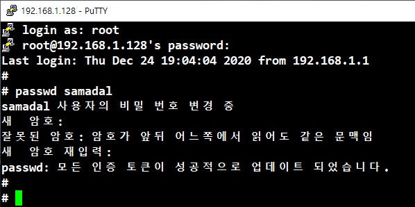> 강사님이 제공한 압축파일의 samadal 비밀번호는 기존에 설정한 1이 아님, 비밀번호 1로 변경하기