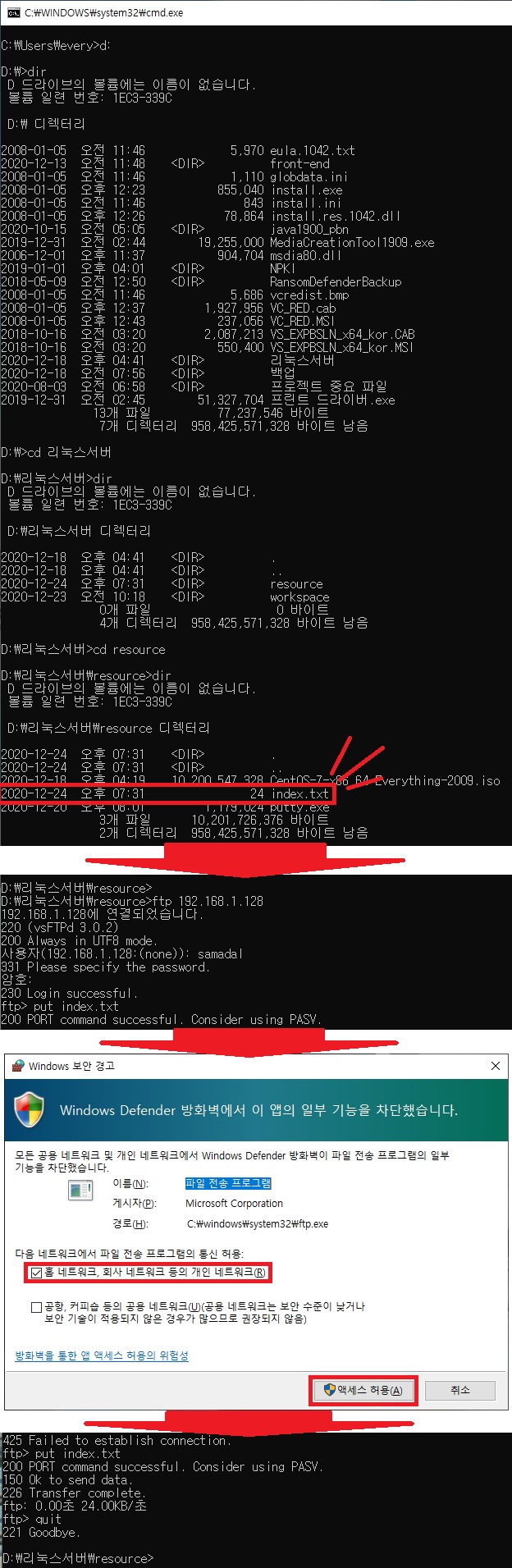 ① 업로드(클라이언트에 있는 파일을 서버로 전달) : cmd 경로 맞추기 > ftp [CentOS IP 주소] > put [업로드할 파일명]