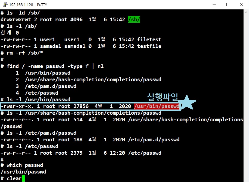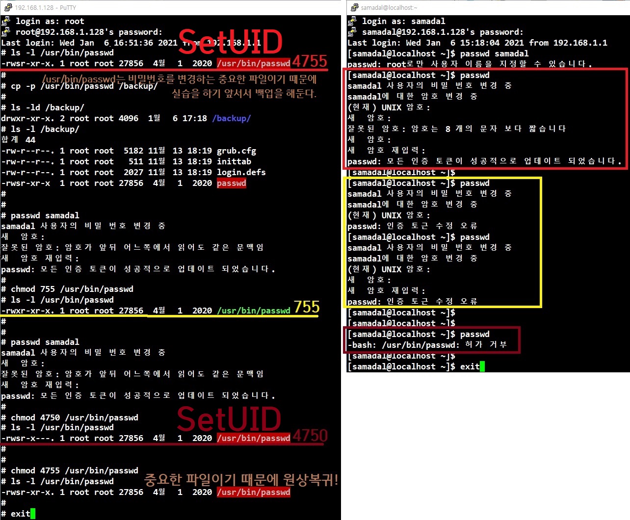 6. setUID, setGID의 소문자 s는 x 권한을 포함, 대문자 S는 x 권한을 포함하지 않는다.