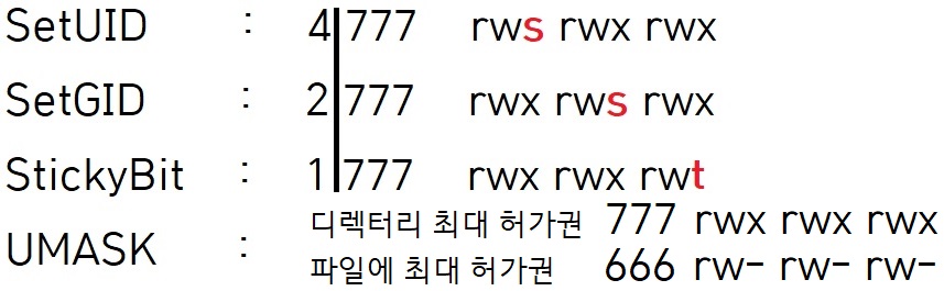 ** 디렉터리의 최대 허가권은 rwxrwxrwx 777, 파일의 최대 허가권은 rw-rw-rw- 666이다.