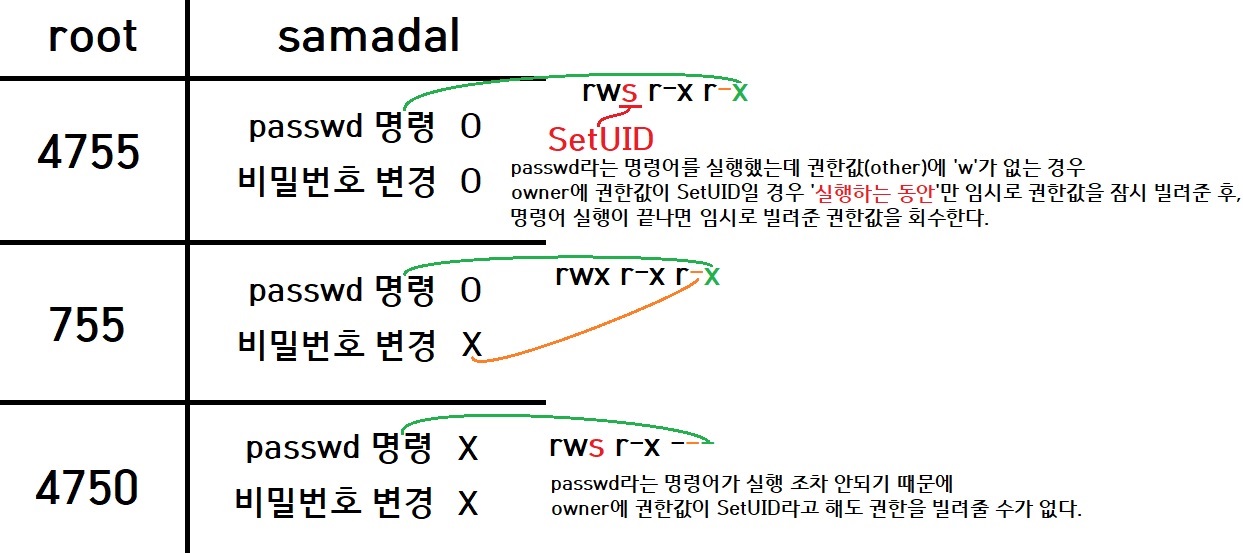 : 사용자가 SetUID 권한이 설정되어 있는 실행파일을 실행할 경우, 그 파일의 소유자 권한을 가지게 된다.