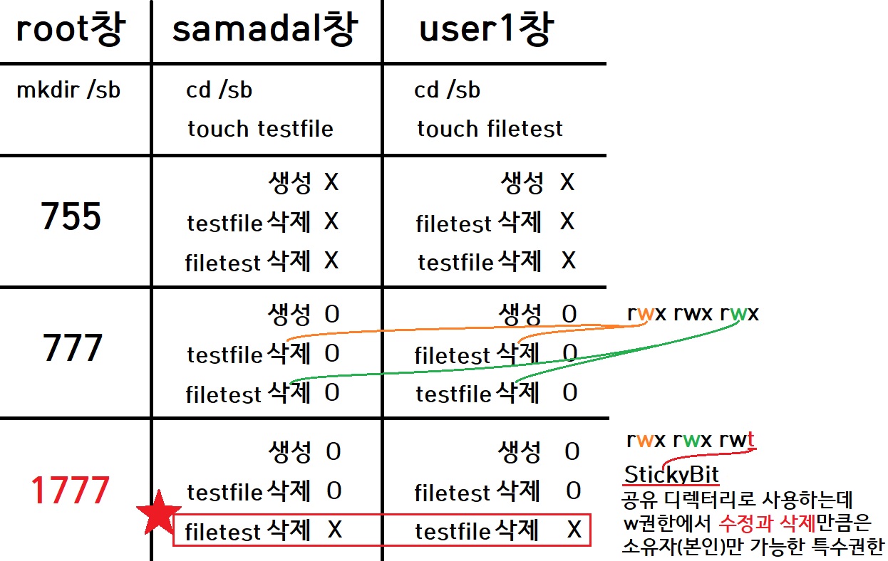 : 해당 권한이 설정되어 있는 디렉터리의 모든 유저는 파일을 생성 및 다운, 업로드 등을 하는 것이 자유롭지만