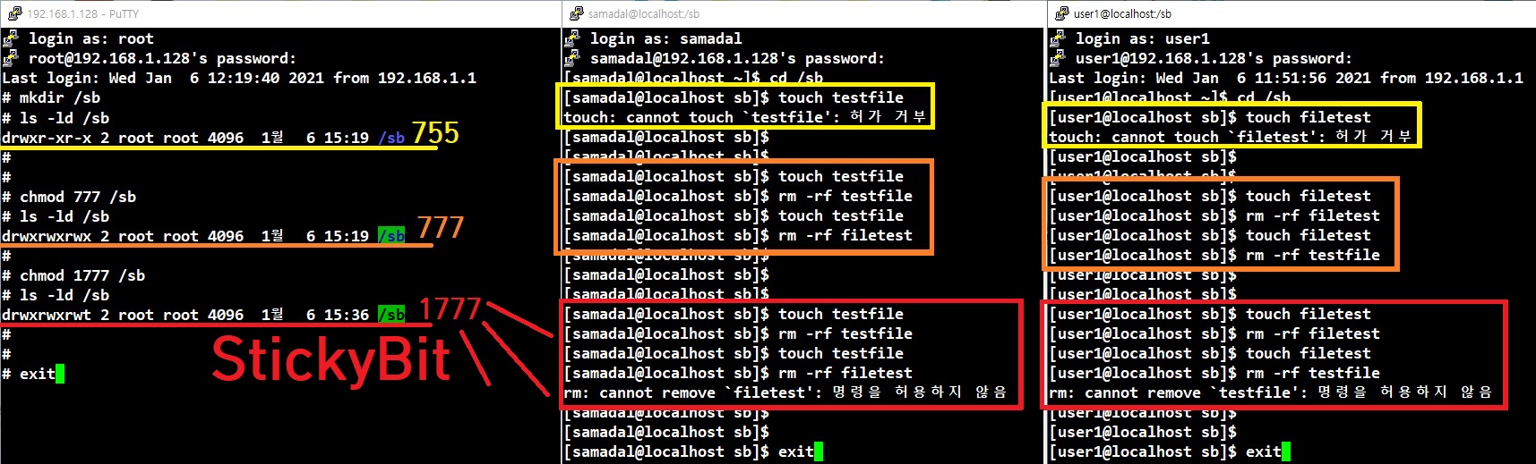 Sticky Bit의 소문자 t는 x 권한을 포함, 대문자 T는 x 권한을 포함하지 않는다.