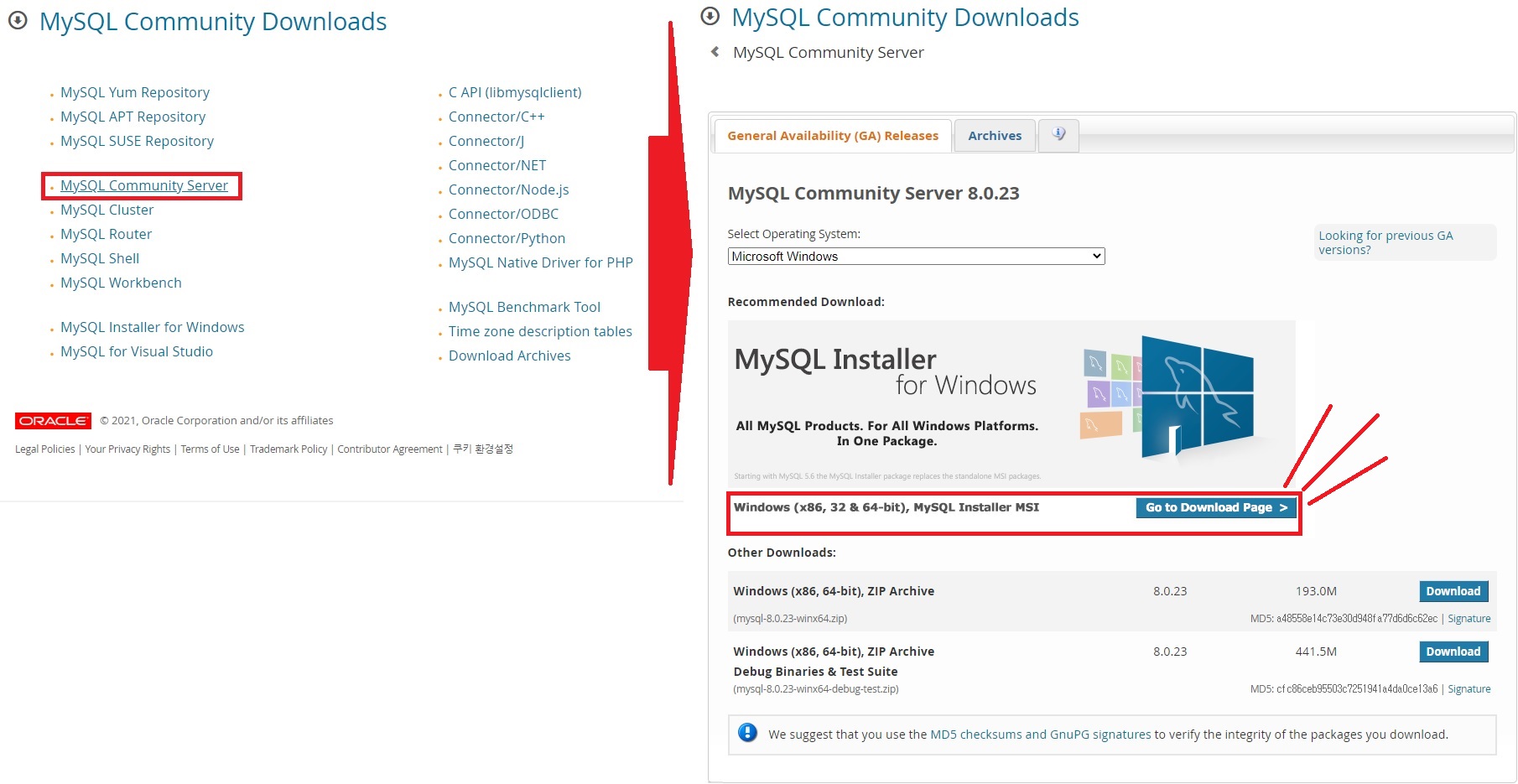 > MYSQL Community Server 클릭 > MySQL Installer MSI의 Go to Download Page 클릭