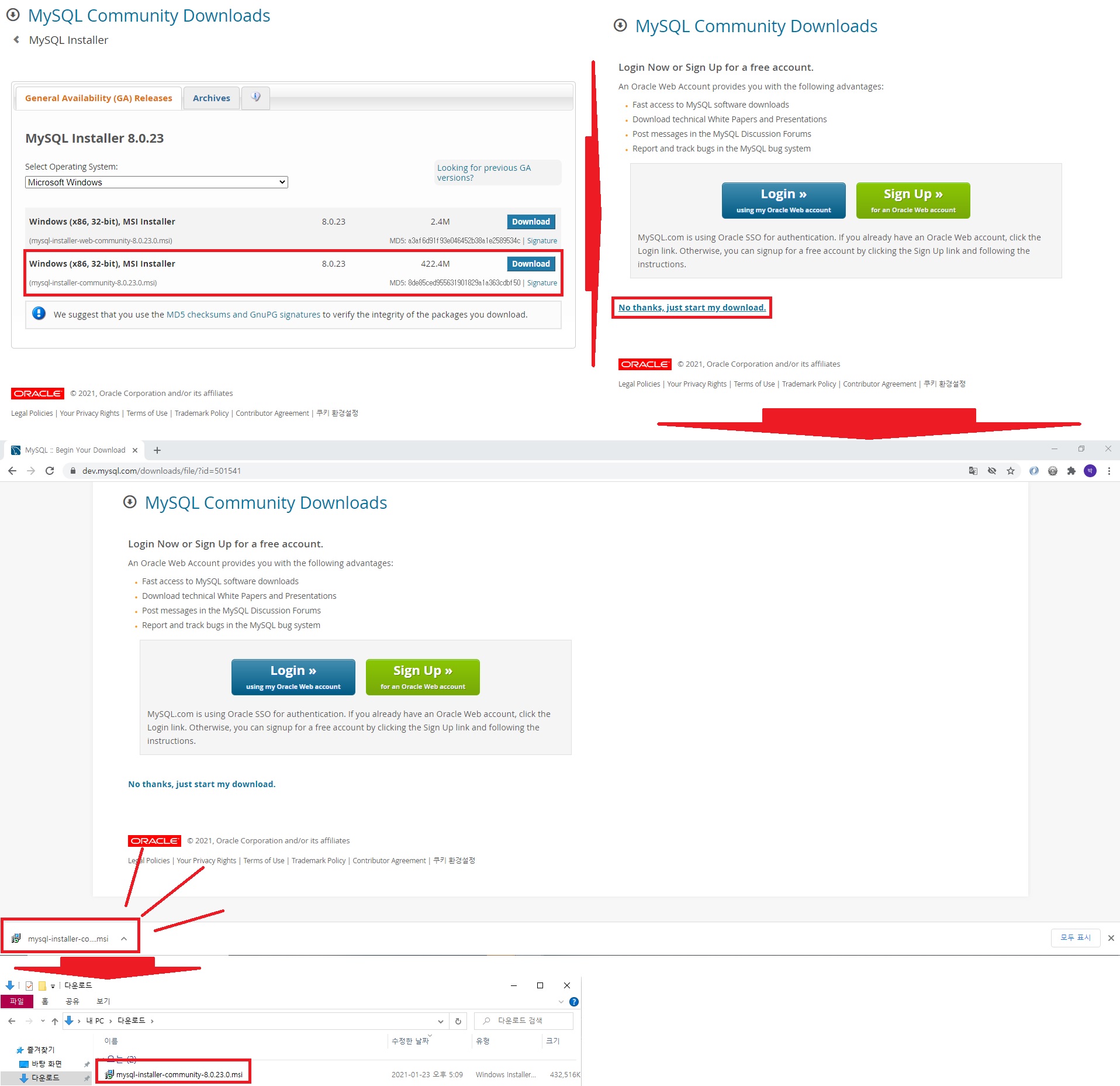 > Windows(x86, 32-bit), MSI Installer 8.0.23 422.4M의 Download 클릭 > No thanks, just start my download 클릭