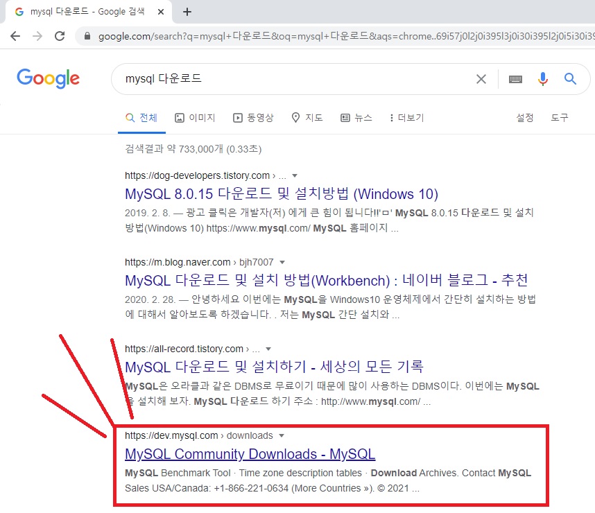 : 구글에 검색하여 다운로드 사이트로 이동하기(MySQL 다운 사이트로 바로가기)