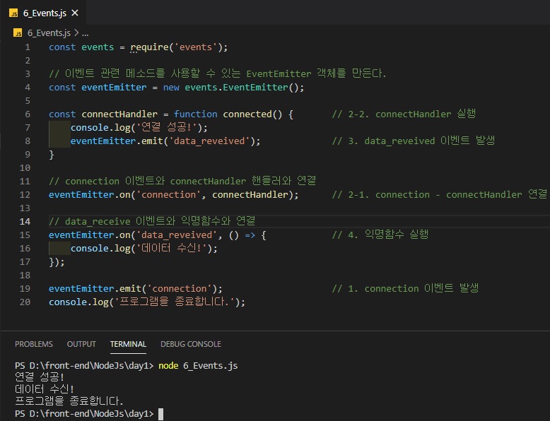 eventEmitter.on('connection', connectHandler); // 2-1. connection - connectHandler 연결
