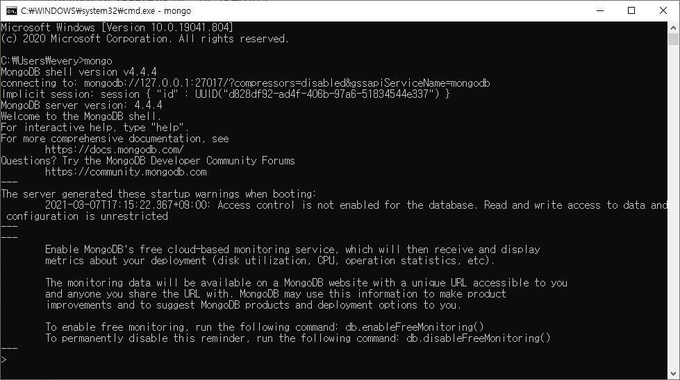 : cmd창에서 명령어 mongo 실행해서 아래의 사진과 같이 나오면 제대로 설치된 것임!