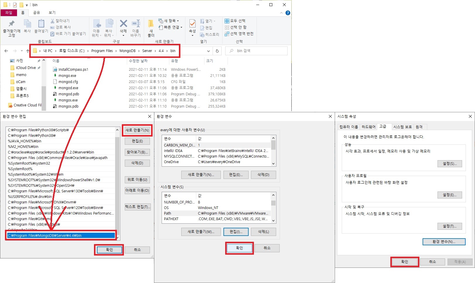 > 새로만들기 클릭 > mongoDB 실행파일 위치 추가 > 확인 클릭 > 확인 클릭