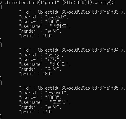 $lte : 주어진 값보다 작거나 같은 값을 찾는다.