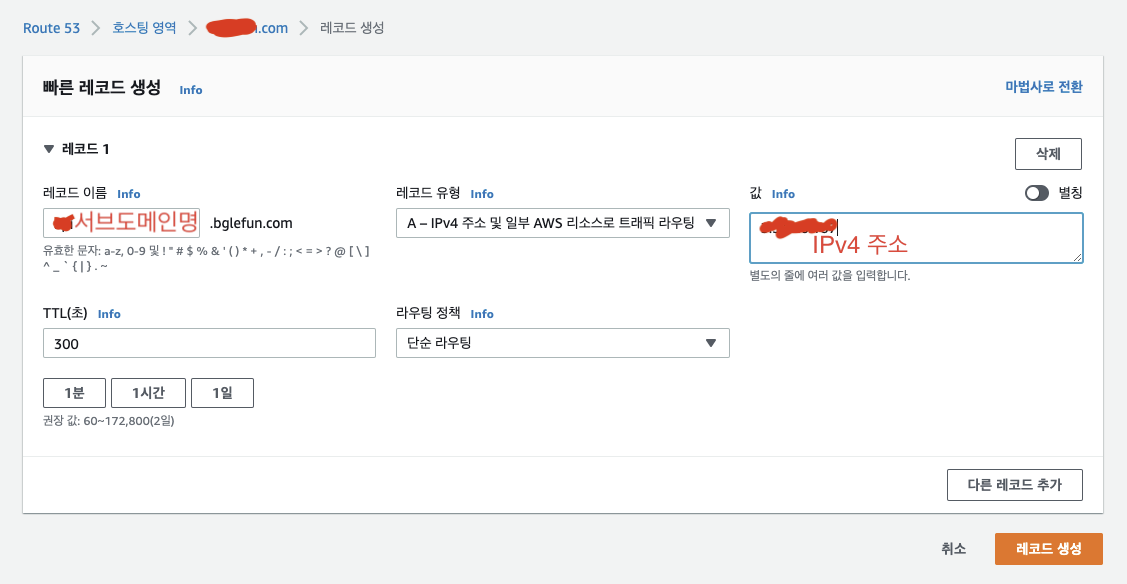 ** Route 53 > 호스팅 영역 > 작업하고자 하는 도메인 클릭 > 레코드 생성 클릭