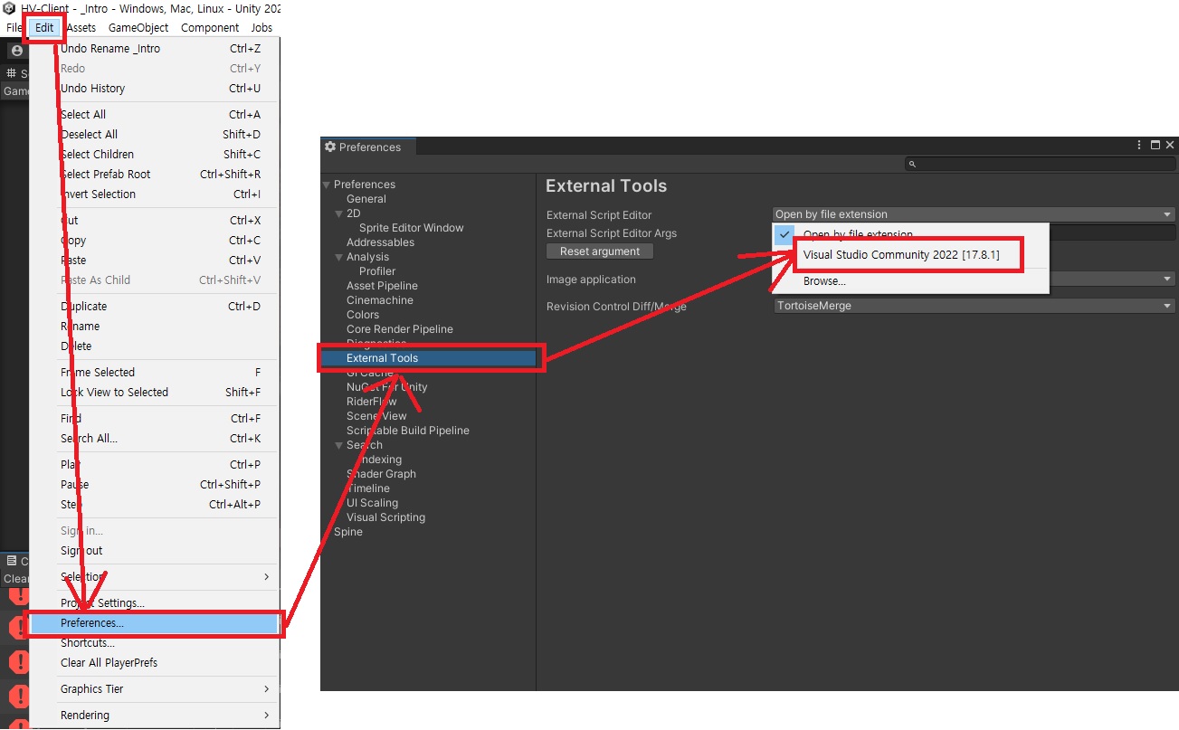 ** Edit > Preferences... > External Tools > External Script Editor > 비주얼스튜디오 선택