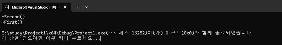 ** 유도 클래스의 객체가 소명될 때에는, 유도 클래스의 소멸자가 실행되고 난 다음에 기초 클래스의 소멸자가 실행