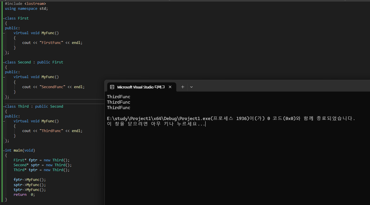 가상함수 테이블(V-Table, Virtual Table: 실제 호출되어야 할 함수의 위치정보를 담고 있는 테이블)을 만듦