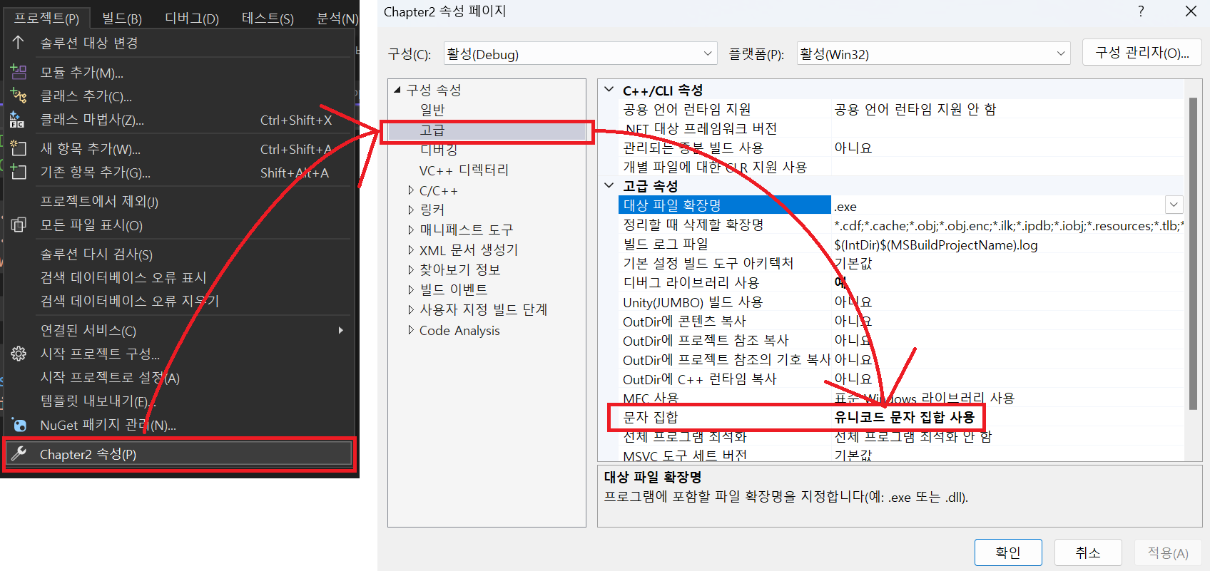 프로젝트 > 속성 > 구성속성 > 고급 > 문자집합에 유니코드로 되어 있는지 확인하기