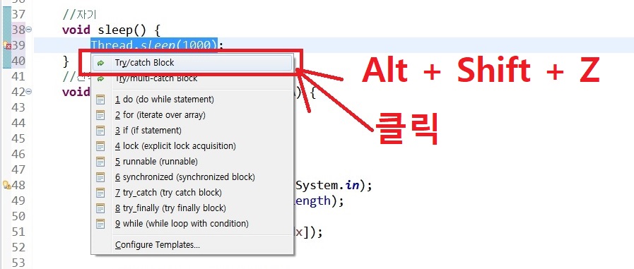 * Alt + Shift + Z : 예외 처리(try~catch)