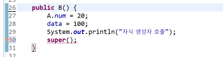 B obj = new B(); //부모생성자가 먼저 호출된 다음에 자식 생성자가 호출된다는 증거