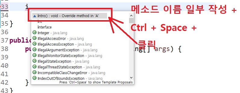 ** 메소드 이름 일부 쓰고 Ctrl + Space : 재정의