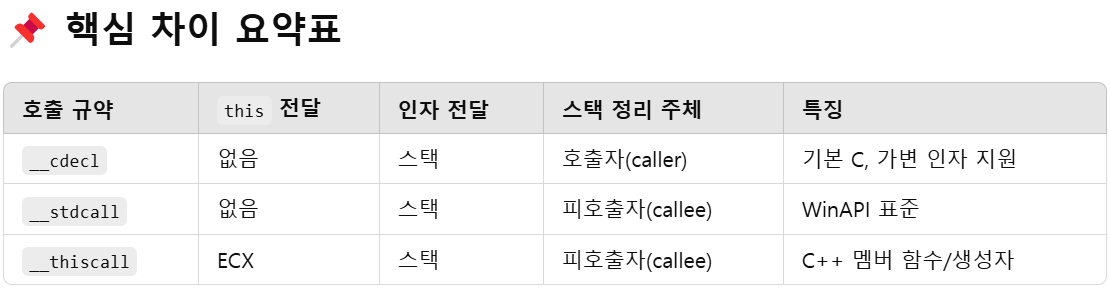* MSVC 컴파일러에서만 명시적으로 __thiscall 존재, 표준 아님